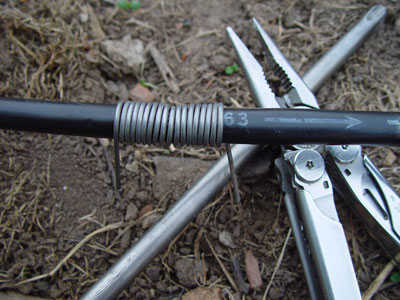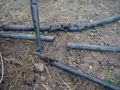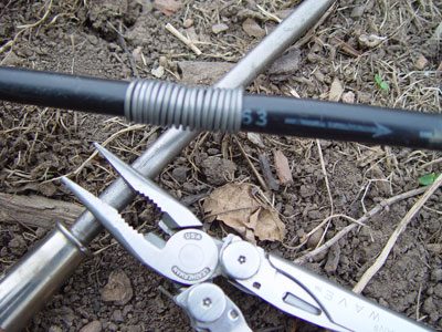 Here I am just using what is laying around to make a job simpler. A cat or something chewed up our Polypropylene drip line in our garden. So, I took a wire that was used to flag that the lawn had been sprayed and used it to make a spring. The spring was used to hold the ends of the drip line together so that Rapid Repair could then bond it back together.